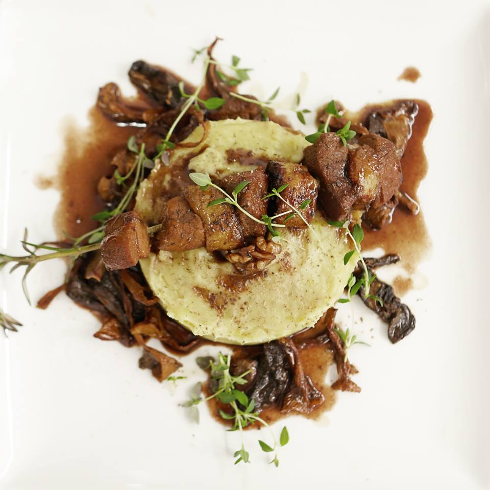 Przepis na szaszlyk z karmelizowanych banan?w i poledwicy wieprzowej, podany z puree ziemniaczanym z jajem przepi?rczym i sosem z lesnych grzyb?w.